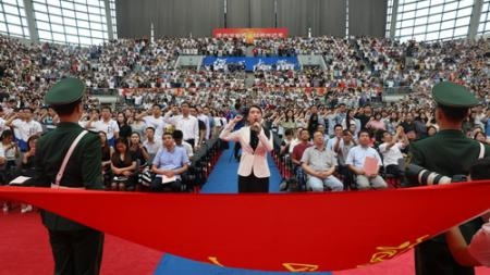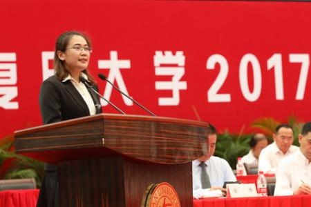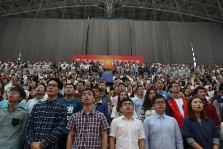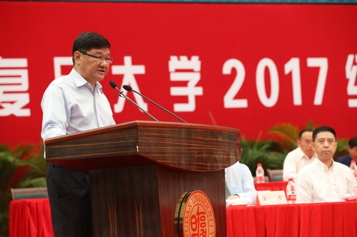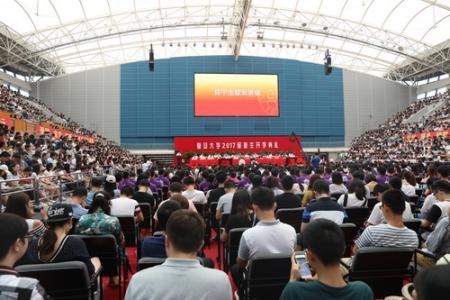 9月8日上午,复旦大学2017级研究生开学典礼在正大体育馆隆重举行。来自世界各地的研究生新生参加了开学典礼。校党政领导,校学术委员会、学位评定委员会、教学指导委员会负责人、十佳“三好”研究生导学团队导师代表、新任博士生导师代表,以及全校各院系和部分机关部处的负责人应邀出席。