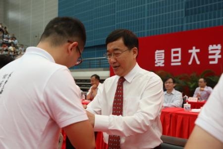 主席台前排就座的校领导和老师为新生代表佩戴上校徽。从这一刻开始,他们正式成为复旦人,共享复旦人的荣耀,共担复旦人的责任。全场新生在研究生会主席王丹的带领下郑重宣誓:“胸怀远大理想,关注人类命运,忠于祖国,热爱人民,探求真知,追求卓越,勤学励行,勇于创新,遵纪守法,文明诚信,弘扬复旦精神,恪守学术道德,为学校争光添彩,为国家贡献力量!”