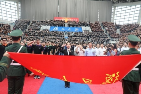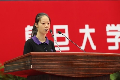 在主席台前排就座的校领导和老师们为新生代表授戴校徽后,复旦大学学生会主席朱栎瑶同学带领全体新生面向校旗郑重宣誓:“今天我成为一名光荣的复旦大学学生,从今后,明道重志、修德立诚,隆师取友、专一有恒,博学明辨、谨言慎思,笃志求是、躬行践履,心系国家、兼济天下。今天我为复旦而自豪,明天复旦为我而骄傲!”