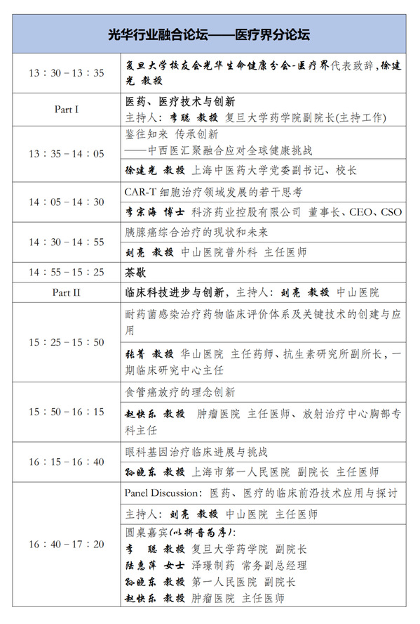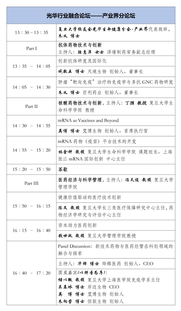 当天下午举行了光华行业融合论坛。论坛邀请来自生命健康领域的科学界、医疗界、产业界的优秀人才共同探讨中国生命健康领域科技“源头创新”、“未来发展”的新思路、新问题和新答案,力争形成“复旦范式”。