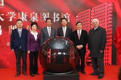 许健康、陈家泉、焦扬、许宁生共同为康泉图书馆揭牌并揭幕楼铭。焦扬、许宁生代表学校向许健康、陈家泉赠送了纪念品——比例为1:300的3D打印版康泉图书馆大楼模型。
