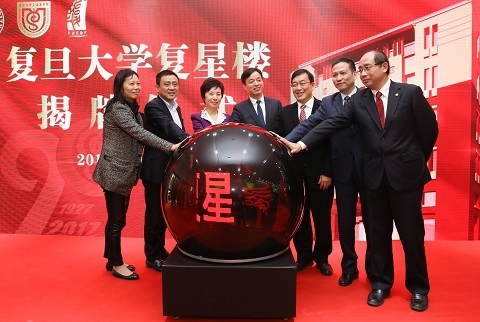 校党委书记焦扬,校长许宁生,校党委副书记许征,副校长张志勇,复星国际CEO 汪群斌,复星国际联席总裁、复星医药董事长陈启宇,复星高科党委书记、复星国际高级副总裁、复星基金会理事长李海峰共同为“复星楼”揭牌