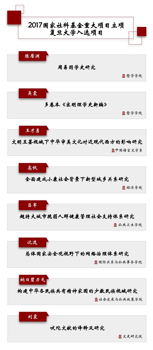 日前,全国哲学社会科学规划办公室公布了2017年国家社科基金重大项目立项名单,复旦大学8个项目入选。国家社科基金重大项目是目前国家社科基金中层次最高、资助力度最大的项目类别,本年度共331个项目入选,分属136家单位。