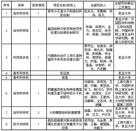 日前,2017年度高等学校科学研究优秀成果奖(简称教育部奖)结果公布。复旦大学作为第一完成单位的三个项目“有序介孔高分子和碳材料的创制”、“基因组拷贝数变异的突变机理与致病机制研究”、“内镜微创治疗上消化道肿瘤技术体系的创建与推广”荣获2017年度教育部奖一等奖;物理学系特聘教授张远波、附属中山医院肝外科副主任医师高强荣获2017年度教育部奖青年科学奖。另外,我校参与合作的项目获一等奖2项,二等奖1项。