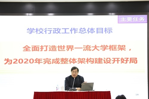许宁生在部署全校行政工作重点时指出,要全面启动“双一流”方案;全面推进育人质量提升;突出抓好对接国家战略和扩大国际影响力,全面提升科技原始源头创新能力与人文社科学术研究竞争力和活力;巩固提升人才引进工作水平,加强人才培养工作力度,提高教师思政工作水平;紧密对接上海具有全球影响力科创中心建设任务,服务上海经济社会发展;启动对外合作与交流新方案,抓紧落实重要国际合作项目;全面加强、统筹协调、提升质量,提升校园安全水平和校园文化品味;加强资源供给调配,建立共享共担机制,促进可持续发展机制形成,提高全员节约、节省、节支意识;加强校友服务、校外合作,拓展发展平台,扩大社会影响,服务社会。