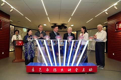 陈灏珠、桂永浩、许征、彭裕文、陈思和与中国书画大家、“医艺承扬 ”题写者陈佩秋先生的代表庞沐兰共同为医艺承扬大讲堂的启动“亮灯”。陈灏珠院士的“第一课”从医德高尚、作风严谨、技术精湛、热心教学、努力科研和终身学习等六个方面,阐述了“做一名好医生”这一主题。