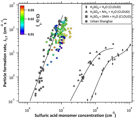 研究结果表明在我国典型城市上海大气新粒子的形成过程中,一个气体硫酸分子和一个二甲胺分子随机碰撞,通过氢键形成稳定的分子簇,分子簇通过与其他硫酸分子、二甲胺分子或其他硫酸-二甲胺团簇的碰撞继续生长;一定尺寸以后,其他物种(例如极低挥发性有机化合物)开始加入这个过程,并最终形成大气新粒子。