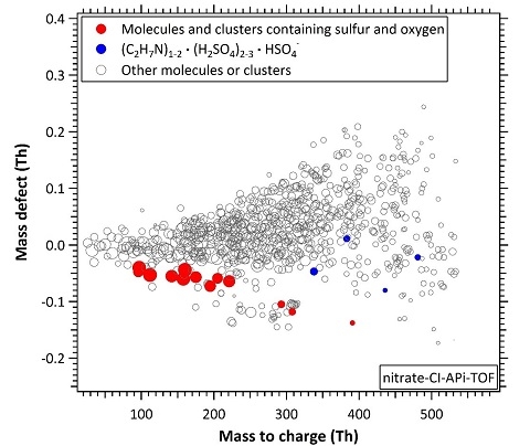 图1.应用硝酸根试剂离子化学电离-飞行时间质谱技术所识别的大气痕量物种的质量亏损图。