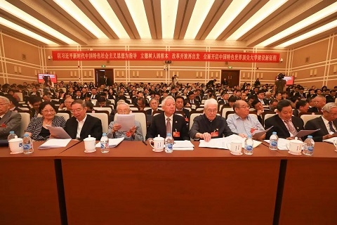 会场里悬挂着“以习近平新时代中国特色社会主义思想为指导 立德树人固根本 改革开放再出发 全面开启中国特色世界顶尖大学建设新征程”的巨幅标语,主席台上金色的党徽和鲜艳的红旗分外夺目。