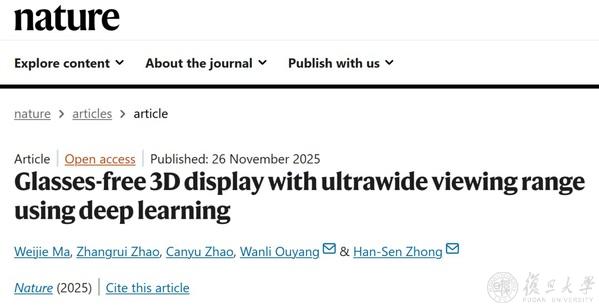 北京时间11月27日凌晨,复旦大学计算与智能创新学院26岁的二年级博士研究生马炜杰以独立一作身份在Nature发表研究成果。该成果横跨三维计算机视觉、计算机图形学、显示光学三个领域,聚焦裸眼3D技术,首次实现桌面级显示尺寸下超宽范围的全视差裸眼3D显示,打破该领域几十年来大尺寸与宽视角“鱼与熊掌不可兼得”的局面。