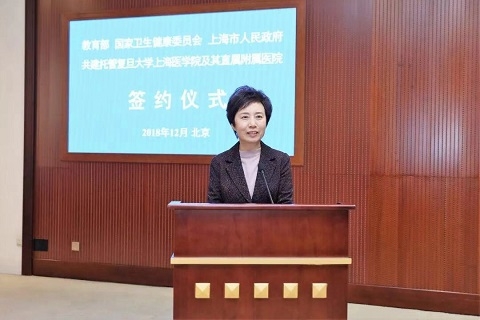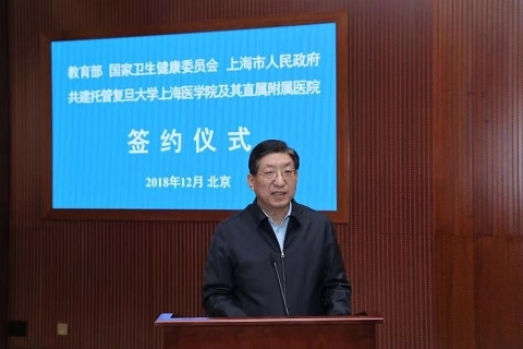 教育部党组书记、部长陈宝生,上海市委副书记、市长应勇,国家卫生健康委员会副主任曾益新出席签约仪式并讲话。教育部党组成员、副部长林蕙青、曾益新、上海市副市长翁铁慧签署共建托管协议。林蕙青主持会议并介绍有关情况。教育部、国家卫生健康委员会相关司局负责同志,上海市人民政府副秘书长宗明和相关部门负责同志出席仪式。复旦大学党委书记焦扬,校长许宁生,常务副校长、上海医学院院长桂永浩,党委副书记、纪委书记袁正宏参加仪式。