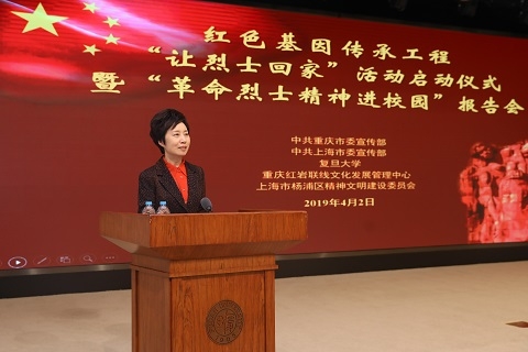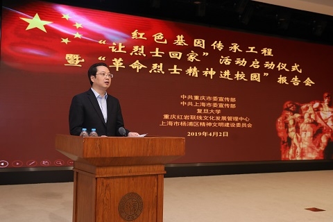 4月2日下午,“让烈士回家”活动启动仪式暨“革命烈士精神进校园”报告会在复旦大学举行。复旦大学党委书记焦扬出席活动并讲话,重庆市委宣传部副部长、文明办主任马岱良,上海市委宣传部副部长、文明办主任潘敏出席活动并先后致辞,中宣部宣教局重大活动处调研员、副处长张德军,重庆红岩联线文化发展管理中心党委书记朱军,上海市杨浦区区委常委、宣传部部长刘东昌,复旦大学党委副书记许征出席活动。许征主持启动仪式,王朴烈士之子王继志作为烈属代表发言,2014级本科生吴松阳作为学生代表发言。复旦大学相关部门负责人、部分师生代表参加活动。