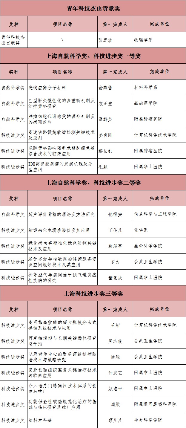 面向国家社会发展和人民生活的需求,复旦科研团队持续发力。在获得上海市科技进步奖一等奖的项目中。计算机科学技术学院教授姜育刚领衔的“高速铁路设施故障检测关键技术及应用”项目研制的综合高速铁路智能故障检测系统,解决了现有故障检测系统普遍存在的精度不足和不易部署的难题,填补了高速铁路设施故障检测领域的多项技术空白,大幅提高了我国铁路设施管理的智能化水平。附属肿瘤医院教授缪长虹领衔的“麻醉策略影响围手术期肿瘤免疫综合技术的临床应用”项目为优化麻醉技术,加快患者术后恢复乃至改善患者中远期预后提供了理论依据和临床指导,有力地推动了我国肿瘤患者围手术期麻醉策略的优化。附属华山医院教授毛颖领衔的“IDH突变胶质瘤的发病机理及分型应用”项目在国际上首先提出胶质瘤代谢致瘤学说,改善了病人预后,提升了我国胶质瘤诊疗水平。
