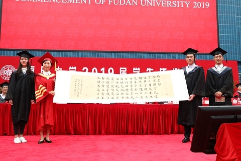 一曲卿云歌,时刻爱复旦。2019届毕业生代表向母校赠送了一幅由楷书“卿云歌”与“复旦印象”系列篆刻印章组成的书法篆刻作品。复旦精神潜移默化的陶冶,中华优秀传统文化的传承和发扬,结合学校书画篆刻艺术教育的成果,与新时代复旦青年的人生理想交相辉映。焦扬代表学校接受了毕业生们的这份深情。
