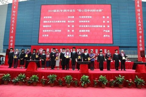 学生收获的硕果离不开师长们的栽培。毕业前夕,2019届本(专)科毕业生开展了“我心目中的好老师”评选活动。“好老师”由同学们自主推选,展现了复旦教师的师德师风,也体现了复旦师生之间的深厚情谊。今年,有10位教师获得了“我心目中的好老师”荣誉称号,12位教师获得提名奖。校党委副书记袁正宏宣读“我心目中的好老师”名单,现场师生共同观看“好老师”短片。莘莘学子难忘师恩,学生代表为获奖老师们献上花环和奖牌,也献上敬意和祝福。