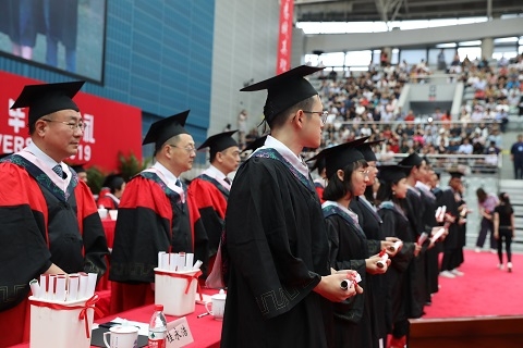 典礼上,全体2019届本专科毕业生迎来最具仪式感的时刻——在场嘉宾、导师代表为毕业生授予学位。帽穗从右边轻轻拨到左边,见证了学子们的成熟、成长、成才。