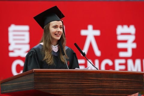 “作为复旦培养的留学生,复旦大学的精神和校风深深的影响了我。‘团结、服务、牺牲’已经成为我生活的追求。”国际文化交流学院2019届汉语言(对外商务汉语方向)专业的俄罗斯学生斯维塔(SVETLANA RZAEVA)作为留学生代表发言。她说,经过在中国的生活,逐渐了解中国人的文化和传统,对中国人百折不挠、自强不息、坚韧不拔的精神十分佩服。她与所有毕业生共勉:“展望未来,我们任重道远!”