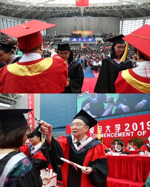 母校也为毕业生们准备了礼物“相辉校友章”,焦扬为毕业生代表佩戴徽章。今年,毕业生们还收到一份特殊的毕业礼物:一套精致的复旦校训藏书章。“博学笃志,切问近思。”母校的期许于方寸间寄托,愿毕业生们不忘校训,时刻谨记读书学习,不废不止。即将成为19届年轻校友的毕业生们正带着复旦人的烙印,奔向属于他们的灿烂前程。