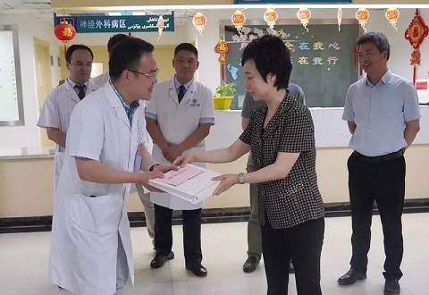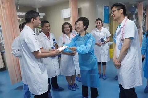 2013年起,复旦大学在喀什二院启动“在职研究生培养项目”,已为医院培养了51名硕士研究生。在心内科冠心病重症监护室,焦扬仔细听取赵刚医生关于近年来附属中山医院“以院包科”援建心内科的相关情况,并向科室几位复旦定向委培硕士生和医生代表赠送了中山医院心内科舒先红教授等主编的《心脏超声入门》。在肿瘤科和神经外科,了解到来自附属肿瘤医院的陈治宇医生和来自附属华山医院的徐锋医生不仅带领当地医生提高医疗技术,还带领当地医生们一起研读文献、申报课题、开展研究、实现突破,多项临床新技术填补南疆空白。焦扬勉励道:“援疆医生不是挂职顶岗,要充分发挥复旦综合优势,在学科、科研、人才培养上都要努力作出贡献。”在附属儿科医院援建的南疆地区首个标准化新生儿重症监护病房,周建国医生介绍了近期几例成功的危重新生儿救治病例,焦扬对他们的成绩给予了高度肯定,鼓励医生们继续攻关,为民族地区医疗事业发展创造更多“奇迹”。在全科医学科,听到来自附属华东医院的唐中豪医生充分发挥专业优势,开展新技术、新项目,赢得了各族群众的一致好评,焦扬称赞道,援疆医生就是在医疗岗位上实实在在地落实党中央治疆方略,为增进民族团结、促进人民健康作贡献。