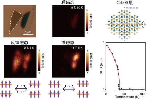 光学二次谐波过程对体系的对称性高度敏感,光学二次谐波的探测方法从体系的对称性入手,能够灵敏地探测体系的反铁磁性。与通常探测磁性的实验手段不同,它不依赖于材料的宏观磁性,而取决于微观磁结构造成的对称破缺。双层三碘化铬在反铁磁态下,其磁结构不但打破了时间反演对称性,也同时打破了空间反演对称性,由此产生强烈的非互易二次谐波响应。当体系升至转变温度以上、或施加面外磁场拉为铁磁态后,磁结构的对称性却发生了改变,这一二次谐波信号也随之消失。