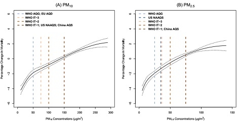 研究结果显示,可吸入颗粒物(PM10)、细颗粒物(PM2.5)短期暴露可显著增加居民的死亡风险;短期内细颗粒物浓度和粗颗粒物浓度的增加,与总死亡率、心血管死亡和呼吸道疾病死亡之间存在统计学的显著相关性。研究还表明,在低于主要国际组织和国家的空气质量标准限值之下,暴露反应曲线呈近乎线性增加,且不存在明显的阈值,提示应进一步收紧空气污染治理的相关标准和政策。