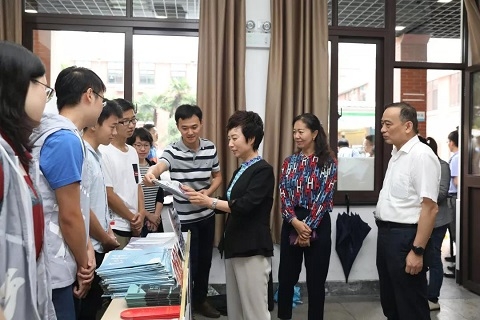 当天,复旦大学领导及相关部门负责人来到报到现场和新生宿舍看望新生和家长,并亲切慰问了服务在迎新一线的工作人员。
