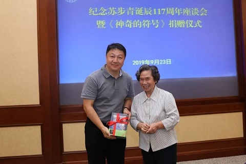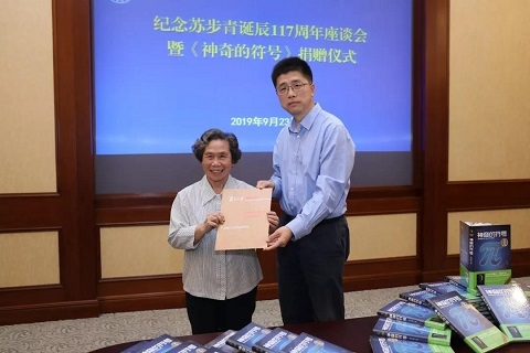 9月23日下午,纪念苏步青诞辰117周年座谈会暨《神奇的符号》捐赠仪式在复旦大学子彬院举行。座谈会前,校党委书记焦扬会见了苏老家属代表、学生代表及老教授协会代表。生命科学学院教授乐云仙作为家属代表介绍《神奇的符号》一书情况,并向焦扬赠书。