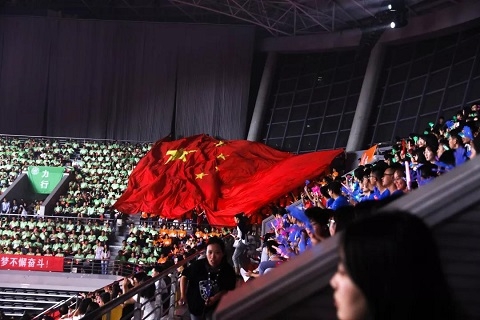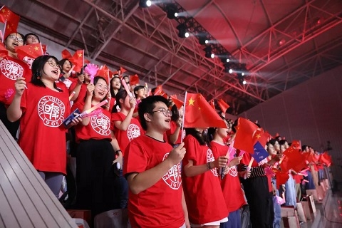 到场的学生观众身着红、蓝、橙、绿四色汗衫,分列为“爱国”“励志”“求真”“力行”四大方阵。在拉歌环节,他们接力合唱《大中国》《今天是你的生日,我的中国》《我的中国心》《歌唱祖国》,揭开了“我的祖国我奋斗”的歌会篇章。拉歌过程中,舞台的边界消弭,正大体育馆成为欢歌的海洋,他们纵情歌唱,交相辉映,唱出复旦青年的最强音,将本场演出推向高潮。