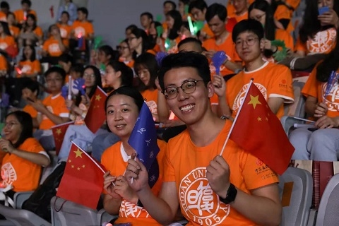 鲜艳的巨幅国旗在全场传递,掀起了歌会的第一个高潮。新中国成立以来复旦的一个个发展瞬间,在校友任科来的歌声《追寻》中,感动了全场的师生。