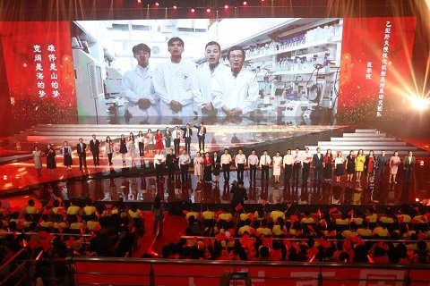 在药学院程能能教授和生命科学学院宋艺演唱的《不忘初心》歌声中,复旦大学70年来的发展历程在大屏幕上一一呈现,2019年“钟扬式”好团队教师代表带来的一首“共筑中国梦”,共同将现场推向又一个高潮。