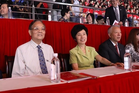 9月29日晚,正大体育馆内,复旦人欢庆的声音如浪潮般跃起,在红色和金色的海洋里欢腾。距离新中国成立70周年还有两天,由复旦师生自编自导的“我和我的祖国——复旦大学庆祝中华人民共和国成立70周年主题歌会”在正大体育馆上演,焦扬等校党政领导,秦绍德、王生洪等学校老领导,蔡彤校董,上海医学院党政领导,中国银行上海分行行长、校友赵蓉,各院系、部处、附属医院相关负责人以及3000余名师生、校友一起观看演出,共同书写一段属于复旦人的国庆记忆。