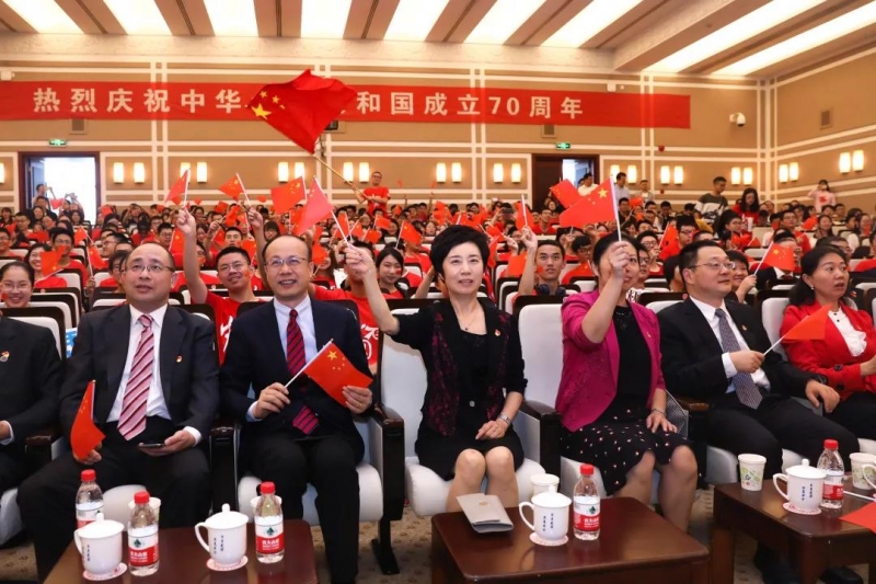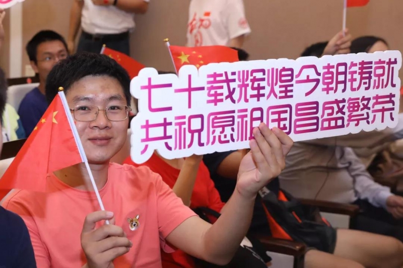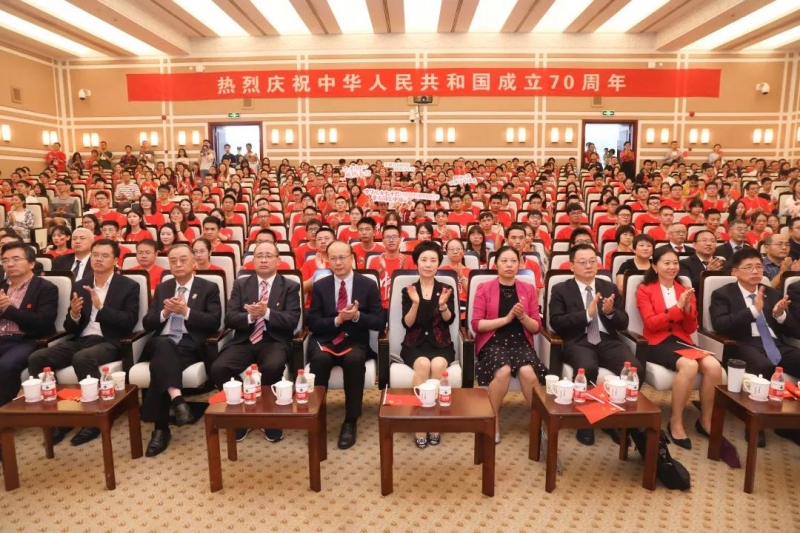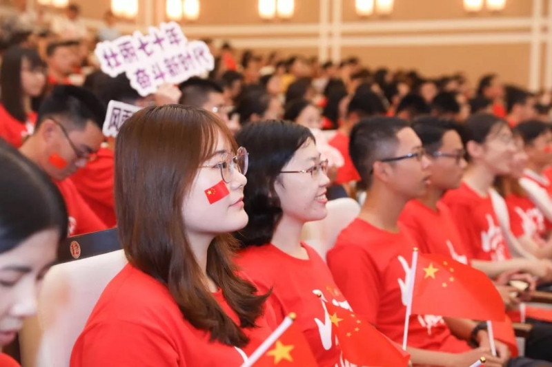 在邯郸校区,光华楼东辅楼202报告厅汇成一片红色的海洋。“热烈庆祝中华人民共和国成立70周年”横幅高挂,鲜艳的五星红旗在手中挥舞、在胸前闪亮,“我和我的祖国”定制校名T恤衫映衬着青春朝气,“不忘初心 砥砺前行”“奋斗七十载 共结中国心”“日月光耀七十载 华夏儿女共此时”“中华民族心连心 协力共圆中国梦”等数十块多彩的KT板标语道出师生们心间的喜悦与昂扬。