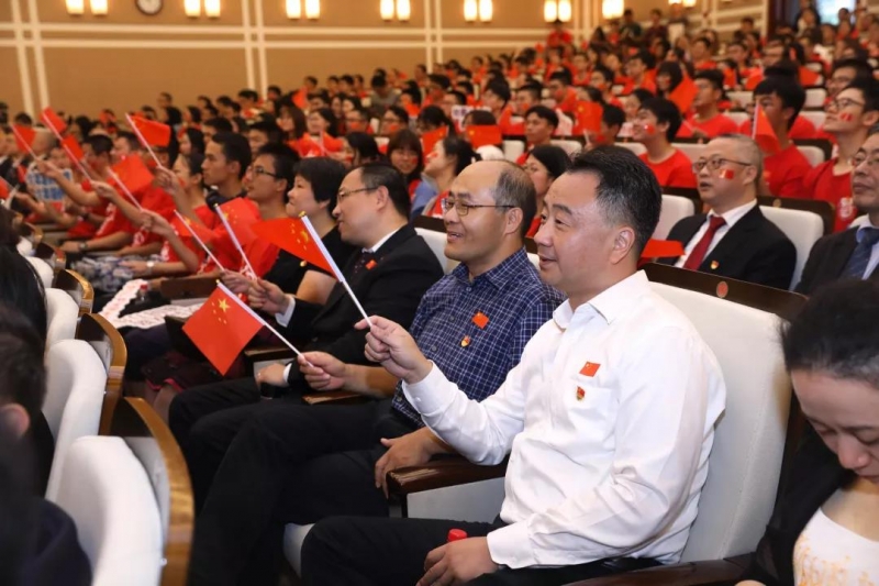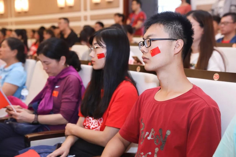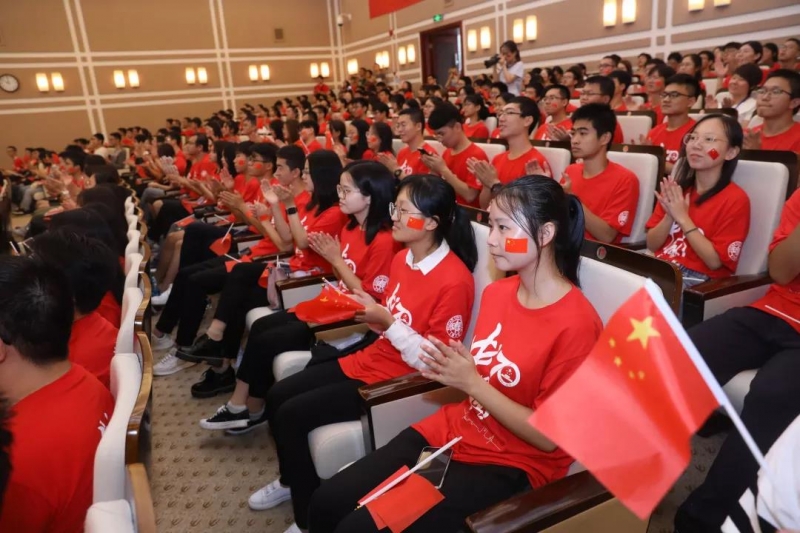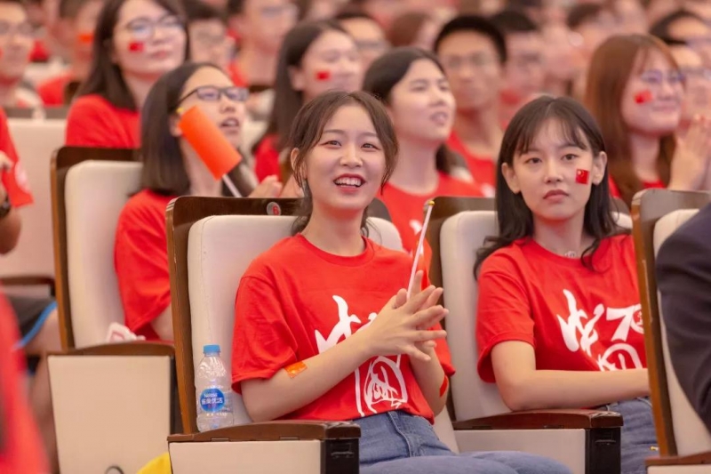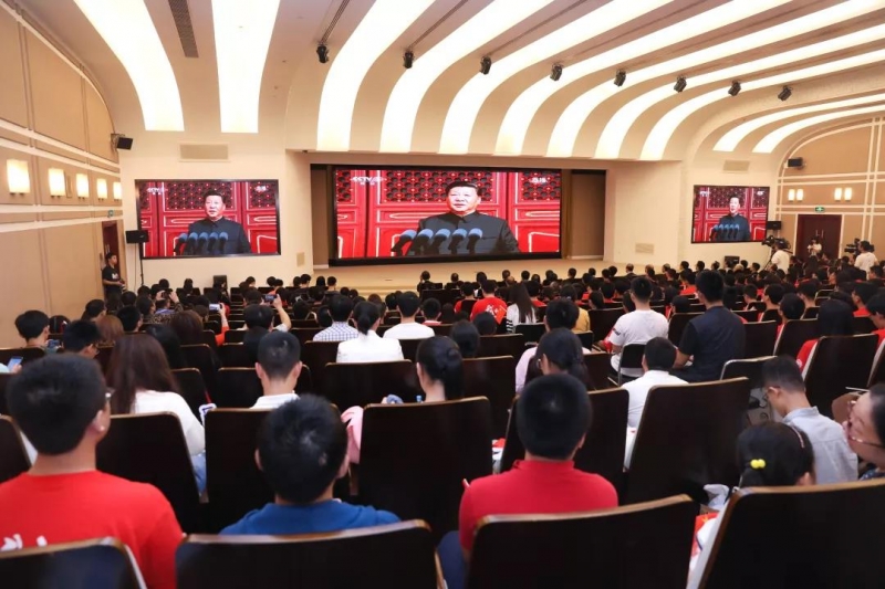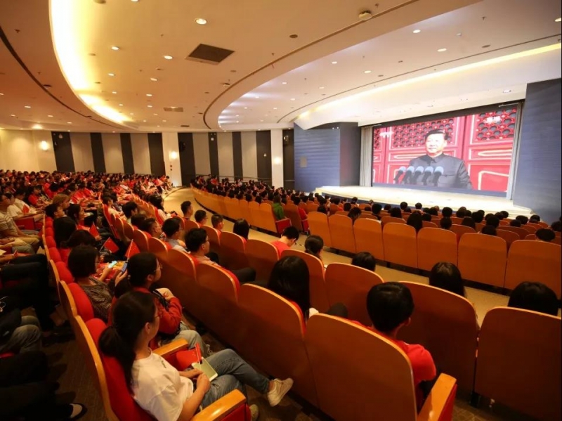 师生们认真聆听习近平总书记的讲话。“今天,社会主义中国巍然屹立在世界东方,没有任何力量能够撼动我们伟大祖国的地位,没有任何力量能够阻挡中国人民和中华民族的前进步伐。”“全党全军全国各族人民要更加紧密地团结起来,不忘初心,牢记使命,继续把我们的人民共和国巩固好、发展好,继续为实现‘两个一百年’奋斗目标、实现中华民族伟大复兴的中国梦而努力奋斗!”听到这里,现场响起的掌声饱含着师生们的为国自豪的深情和为国奋斗的决心。而当习近平总书记说到“伟大的中华人民共和国万岁!伟大的中国共产党万岁!伟大的中国人民万岁!”现场爆发出雷鸣般的掌声。