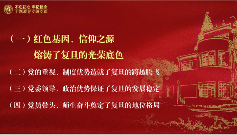 “是红色基因、信仰之源,熔铸了复旦的光荣底色;是党的重视、制度优势,造就了复旦的跨越腾飞;是党委领导、政治优势,保证了复旦的发展稳定;是党员带头、师生奋斗,奠定了复旦的地位格局。”四句话,掷地有声。
