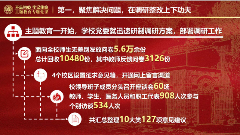 “民心是最大的政治。”焦扬从近年来党委主抓的几件民生大事,如破解教职工子女教育难题和教师住房难题,以及学生关心的食堂、宿舍等基本建设和硬件条件、教师关心的评价激励体系和办公条件等说起,讲了学校在民生方面的努力,也讲了当前遇到的实际困难。“校园民生问题,事关群众基础。”焦扬表示,学校领导班子已经在牵头对师生最关心最现实最直接的利益问题抓整改,努力让师生感受到主题教育实实在在的成果。