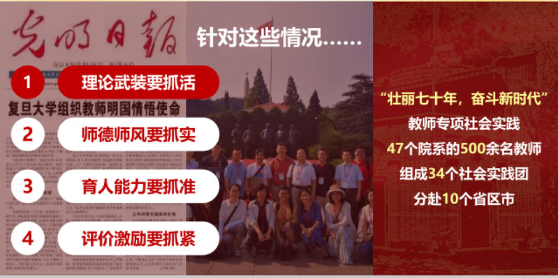 在这堂10月31日举行的“不忘初心、牢记使命”主题教育专题党课上,复旦大学党委书记焦扬这样开场。背景上的幻灯片里,气势恢宏的十幅国庆照片依次播放。这些天安门前的军威震撼和复旦园里的欢庆场景,一下子吸引了全场党员干部的目光。