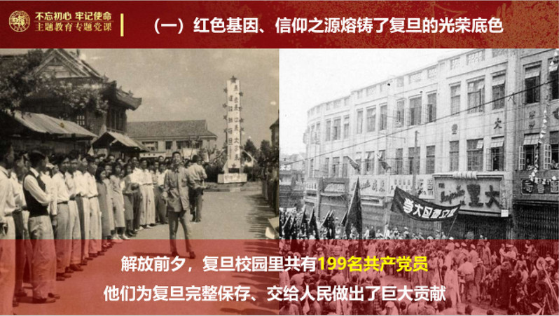 从陈望道翻译《共产党宣言》到红岩烈士为新中国的成立抛头颅洒热血,从复旦成立第一个党支部到学校西迁重庆北碚后党组织带领进步师生投身抗日救亡运动,从一组组70年来学校脱胎换骨的对比数据到一次次学校腾飞跨越的振奋事实,从几任复旦、上医党委书记关心知识分子到在推动思想解放过程中发挥的重要作用,从复旦党委始终发挥把方向、谋大局的作用到团结带领广大党员和全校师生,为教育科学卫生事业发展勤奋工作,为国家富强、民族复兴和人民幸福不懈奋斗……焦扬娓娓道来一件件鲜活的历史事件,一串串详实的历史数据,一个个耳熟能详的闪亮名字,带领大家回顾了复旦的发展历程,令人心潮澎湃。