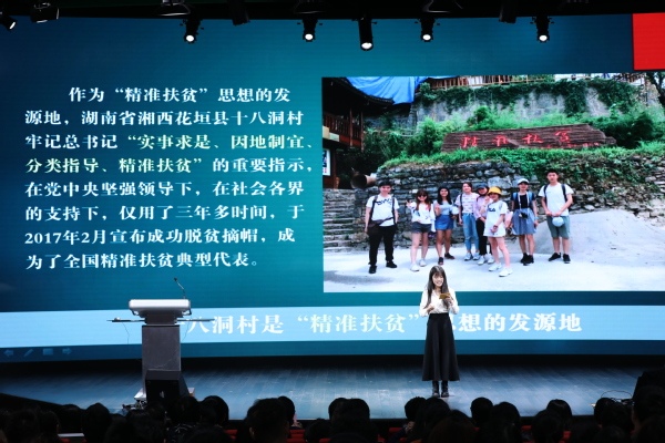 国务学院的澳门籍学生冼颖瑜以“领略祖国变化,助力乡村振兴—港澳青年在行动”为题分享了她的实践和感受。暑期,她参加学工部组织的港澳学生暑期社会实践活动,随队前往湖南省花垣县十八洞村,她表示国情考察让港澳学生深入接触了国家的乡村,了解到国家的扶贫政策实施和乡村的实际改变,亲眼看到党领导下的国家的精准扶贫政策带来的巨大改变,也联想到澳门回归祖国二十年来背靠祖国日新月异的高速发展。“我们将会在今后后的学习生活中传承好爱国爱澳优良传统,利用好复旦搭建的自我发展的成长平台,成为有理想、有道德、有能力的青年。”
