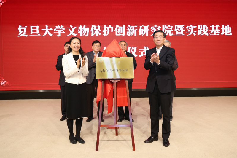 在文化部原副部长、国家图书馆原馆长周和平,国家图书馆理事会理事长、国家图书馆原馆长、复旦大学中华古籍保护研究院荣誉院长韩永进,文化和旅游部公共服务司巡视员陈彬斌和中国科学院院士、复旦大学中华古籍保护研究院院长杨玉良的见证下,复旦大学党委副书记尹冬梅和国家图书馆馆长饶权为复旦大学文物保护创新研究院揭牌。同时,新成立的文物保护创新研究院与上海市历史博物馆、上海市档案局(馆)共建研究和实践基地也揭牌成立。中华古籍保护研究协会会长刘惠平、上海市档案局(馆)局长徐未晚、上海市历史博物馆馆长胡江与复旦大学图书馆馆长陈思和参与揭牌。