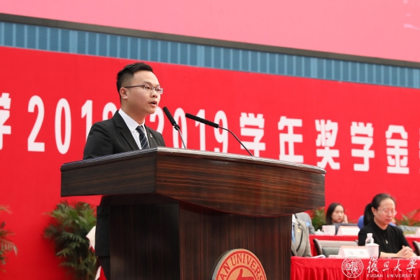 国家奖学金获得者、高分子科学系2017级硕士生魏博磊作为获奖学生代表在发言中分享了自己“在科研中收获快乐,在奉献中体会成长”的经历,并表示,对复旦学子来说,求学不仅为求生活的技能,更应不忘笃志,志大人之学,志远大理想,为民族复兴铺路架桥,为祖国建设添砖加瓦。