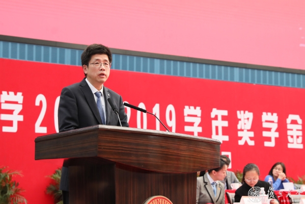 张人禾宣读了“复旦大学奖(助)学金评审委员会关于表彰2018-2019学年奖学金获奖学生的决定”,徐雷宣读了校外冠名奖学金获奖学生名单。校奖(助)学金评审委员会委员、党委学生工作部部长徐阳宣读了2018-2019学年奖学金评审工作报告。