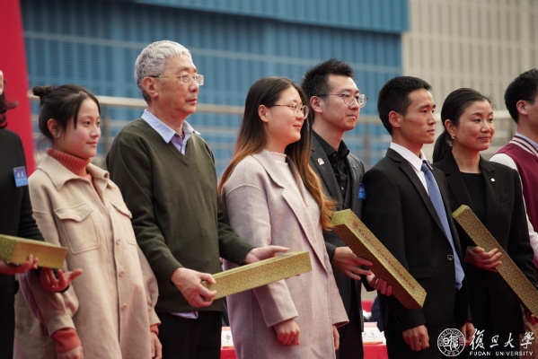 获奖学生代表向设奖单位代表赠送的纪念卷轴,由复旦大学校歌五线谱与极具代表性的校园建筑意象组成的“日月光华,旦复旦兮”八字构成,将复旦百年的沧桑与辉煌、古典与现代、传承与创新,以及复旦学子飞扬的青春旋律完美融合在一起。小小的卷轴承载了获奖学生的梦想,表达了对学校和社会各界的感谢。获奖学生纷纷表示,会将这份认可化作前行的动力,在追逐梦想的道路上奋斗不息。
