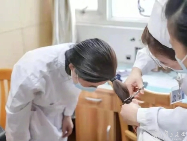 27日上午9时左右,复旦大学附属闵行医院19楼病房的办公室变成了“临时理发室”。作为新一批驰援武汉的医护人员,该院老年科“90后”护士刘文进在出征前毅然剪去了长长的秀发。