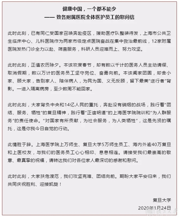 “值得一提的是,1月24日大年夜,学校及时向全校战斗在抗击疫情一线的医务工作者发出慰问信,致以最崇高的敬意和最真挚的祝福。”曾经参与过抗击SARS疫情,有着丰富经验的桂永浩说,“我们要弘扬正气、鼓舞士气!同时也要关心好我们主战场上的工作人员。”在“防控工作专项工作组”微信群内,他也向所有组员关照,“如有不适、精神压力请务必联系我。保护大家安全也是我的责任。”