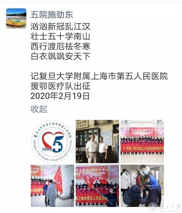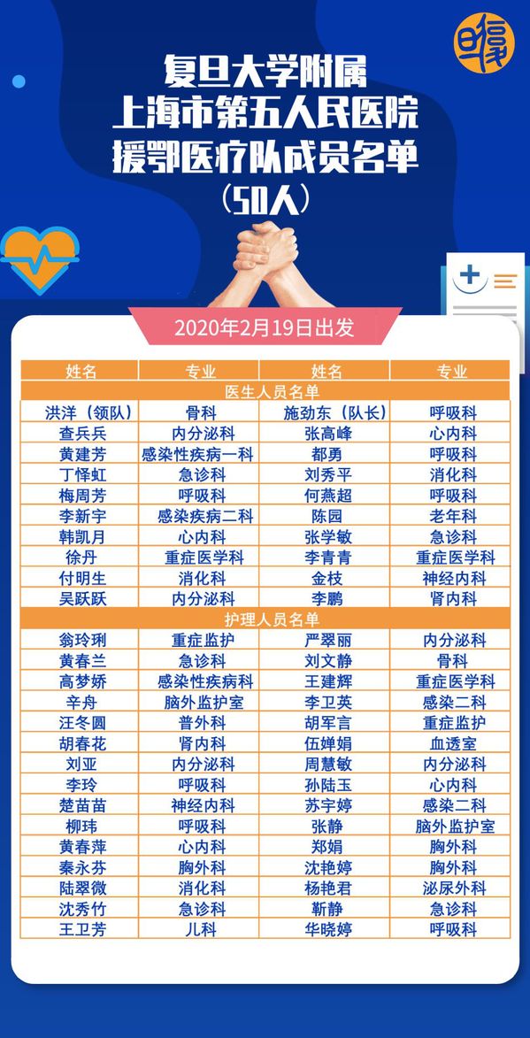 2月19日,500余名医护人员组建的迄今上海最大规模援鄂医疗队出发驰援武汉,支援雷神山医院。其中,就有来自复旦大学附属上海市第五人民医院的50名医护人员。医疗队由临时党支部书记、副院长洪洋领队,全球首例H7N9患者主治医师、呼吸科副主任施劲东担任队长。