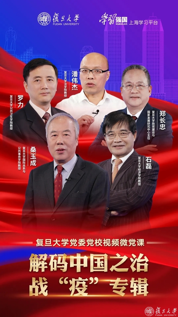 为深入学习贯彻习近平总书记关于疫情防控的系列重要讲话和批示指示精神,教育引导广大党员干部增强“四个意识”,坚定“四个自信”,做到“两个维护”,坚定在以习近平同志为核心的党中央坚强领导下打赢这场疫情防控人民战争、总体战、阻击战的信心和决心,深刻认识中国战“疫”彰显的党的全面领导和中国特色社会主义制度的显著优势,满足疫情防控期间党员干部理论学习需求,3月17日,复旦大学在线推出《解码中国之治·战“疫”专辑》系列视频微党课首讲。