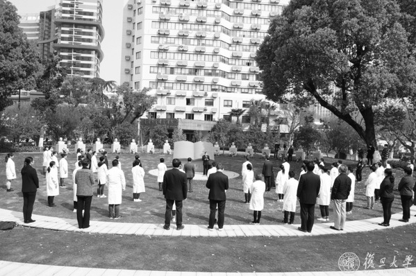 4月4日上午,复旦大学上海医学院西苑同生广场上气氛肃穆凝重,国旗低垂。10时整,校园上空防空警报鸣响,复旦上医师生员工、医务工作者代表200余人在“深切哀悼抗击新冠肺炎疫情斗争牺牲烈士和逝世同胞”的黑白横幅前垂手肃立,庄严默哀三分钟。
