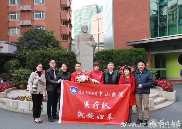 中山重症医学科屠国伟、护理部张晓云终于回家了!中山医院领导及相关业务和职能科室负责人到医疗队隔离酒店接他们回家。“看到久违的同事、亲人,回到中山和家人的怀抱,平安回家了,真好!”