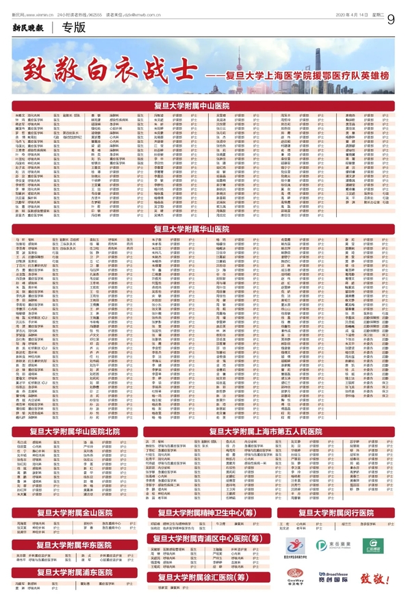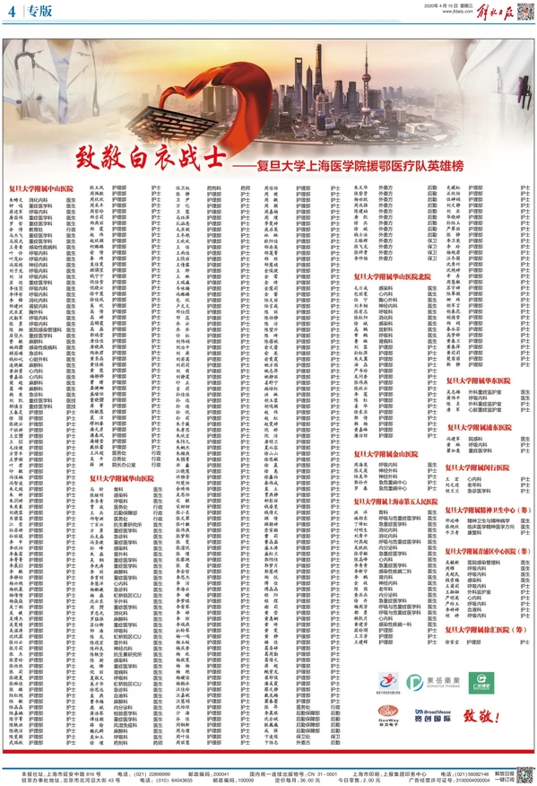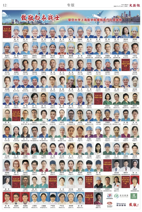 4月14日,《文汇报》三个整版发布复旦援鄂医疗队英雄榜,祝贺战士们凯旋,向英雄们致敬。