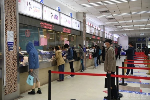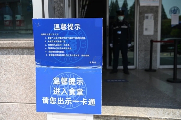 不同于以往多门出入的常态,如今,在所有食堂都可看到单向进出的标识和路线,进口处设置红外测温,提供免洗手消毒液,排队处设置一米线间隔标识。食堂开放时间延长的同时,鼓励校内单位集体提前网上订餐、错峰错时取餐,鼓励师生自带饭盒打包。